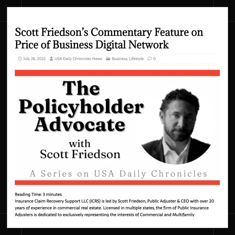 In this nationally syndicated segment, Scott Friedson joins host Kevin Price on the Price of Business Show to discuss the harsh reality many property owners face after catastrophic loss—and what they’re not being told by their insurance companies. Titled “After the Storm”, the interview dives into the hidden pitfalls of commercial insurance claims, why most policyholders are dangerously underrepresented, and how public adjusters like Friedson level the playing field.